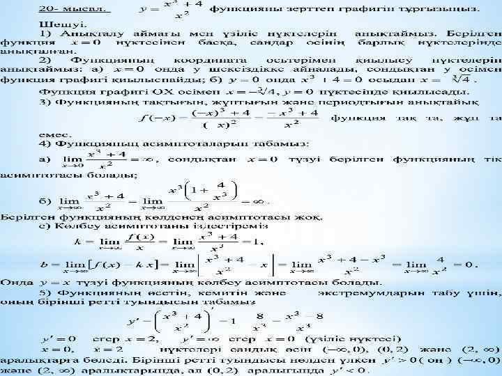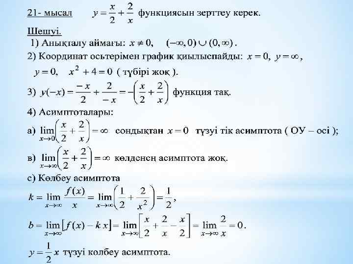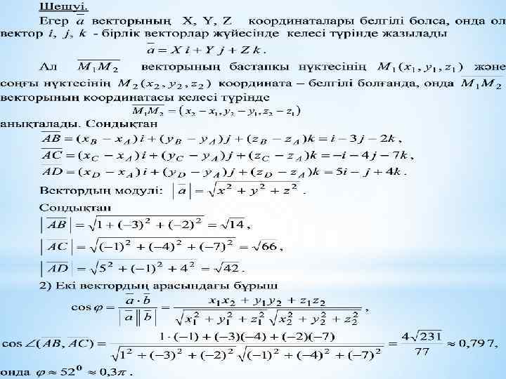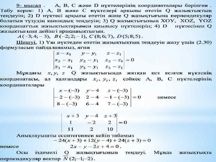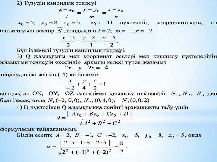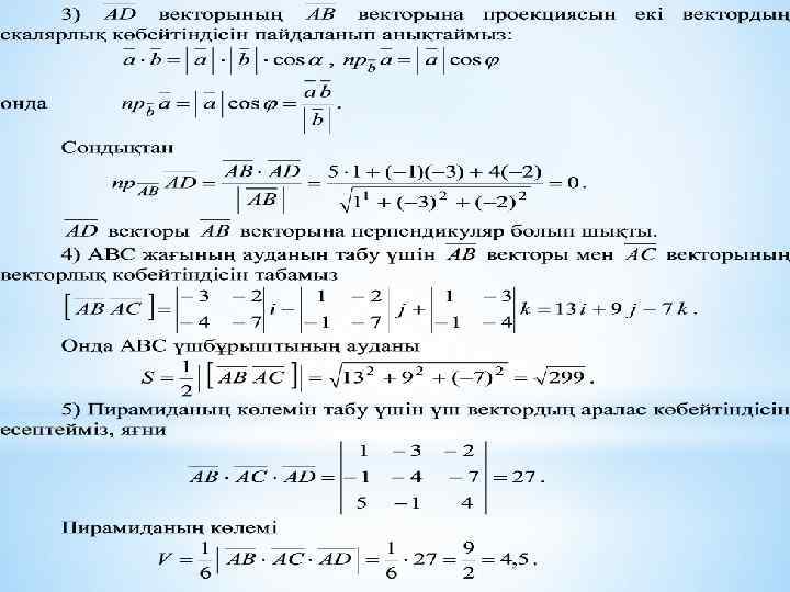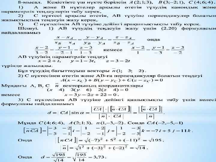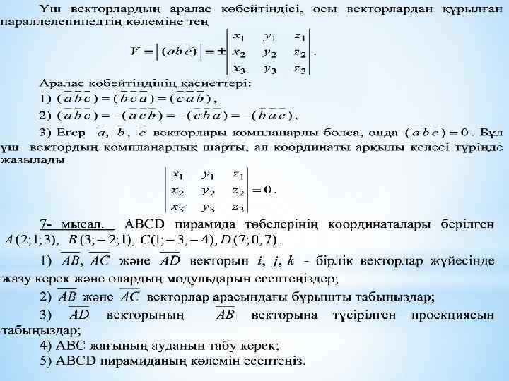 4 – мысал. АВС үшбұрышының төбелерінің координаталары берілсін. Табу керек: 1) АВ қабырғасының ұзындығы; 2) АВС үшбұрышының ауданын; 3) АВ және АС қабырғаларының теңдеулерін және олардың бұрыштық коэффициенттерін; 4) А бұрышын; 5) CD биіктігінің теңдеуін және оның ұзындығын; 6) АЕ медиананың теңдеуін және CD мен АЕ қиылысу нүктесінің координаталарын (О – нүктесі); 7) О – нүктесі арқылы өтетін және АВ қабырғасына параллель болатын түзудің теңдеуін. формуласын пайдаланамыз