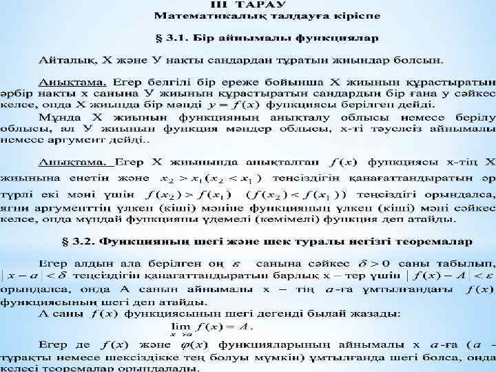 § 1. 1 Матрицалар 1. Матрицалардың түрлері Барлығы m жолдан және n бағаннан тұратын, тік бұрышты кесте m*n өлшемді матрица деп аталады. Яғни, (1. 1) Егер m=n болса, онда матрицаны шаршы (квадрат) матрица деп атайды. Сонда шаршы матрица (1. 2) түрін қабылдады. Мұнда шаршы матрицаның бас диагональ элементтері, ал - қосалқы диагональ элементтері деп аталады. Егер де шаршы матрицаның бас диагоналінің элементтерінен басқа элементтері нөлге тең болса, ондай матрицаны диагональды матрица деп атайды, яғни (1. 3) Диагональдық матрицаның элементтері бірге тең болса, яғни , онда (1. 4) түрін қабылдайды да, мұндай матрицаны бірлік матрица деп атайды.