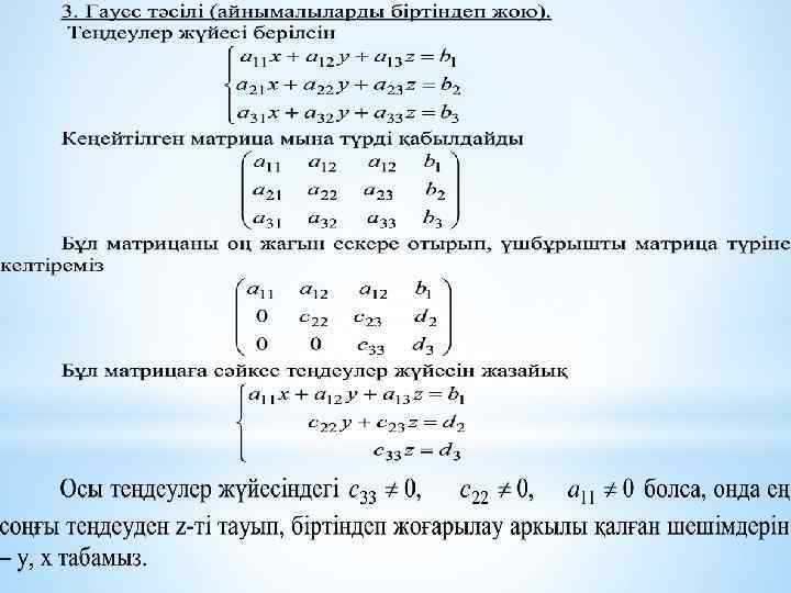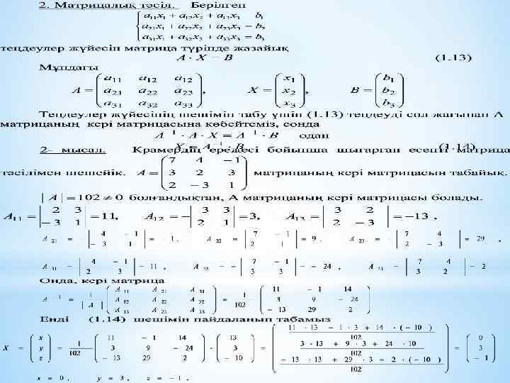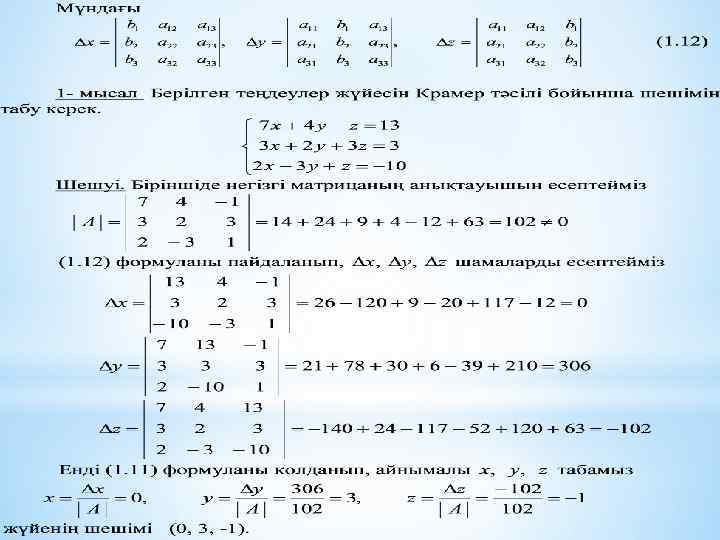 б) Анықтауыштың кез келген жолының (бағанның) элементтері мен басқа жолдың (бағанның) сәйкес элементтерінің алгебралық толықтауыштарына көбейтінділерінің қосындысы нөлге тең. Осы анықтамаларды және анықтауыштың қасиеттерін пайдалана отырып, кері матрицаның есептеу формуласын шығаруға болады. Сонымен кері матрицаның формуласы. (1. 10) Кері матрица болуы үшін, шаршы матрицаның анықтауышы нөлге тең болмауы керек. § 1. 2. Үшінші ретті теңдеулер жүйесі және олардың шешу жолдары 1. Крамер ережесі Егер біртекті емес теңдеулер жүйесінің негізгі матрицасын сәйкес анықтауыш нөлден ерекше болса, онда теңдеулер үйлесімді және шешімі жалғыз ғана болады.