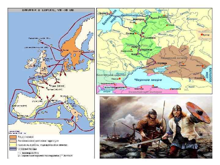 4. 4. Варяги и генезис Древнерусского государства В IX в. на генезис государственности восточных славян стала существенно влияния экспансия варягов (или викингов, норманнов). Варягами были скандинавские племена (особенно, жившие на территории современной Швеции). Причиной их экспансии были суровый климат и невысокая плодородность земель Скандинавии: они побуждали её жителей с оружием в руках искать счастья в южных странах. Иногда варяги захватывали власть над местным населением, например, в северной Франции, в Южной Италии. И у восточных славян основыне центры государственности – Киев и Новгород - в 860 -870 -е гг. оказались под властью варяжских князей: они со своими дружинами (на иллюстрации) захватили власть лишь в Киеве, в Новгороде же их править пригласили сами славяне.