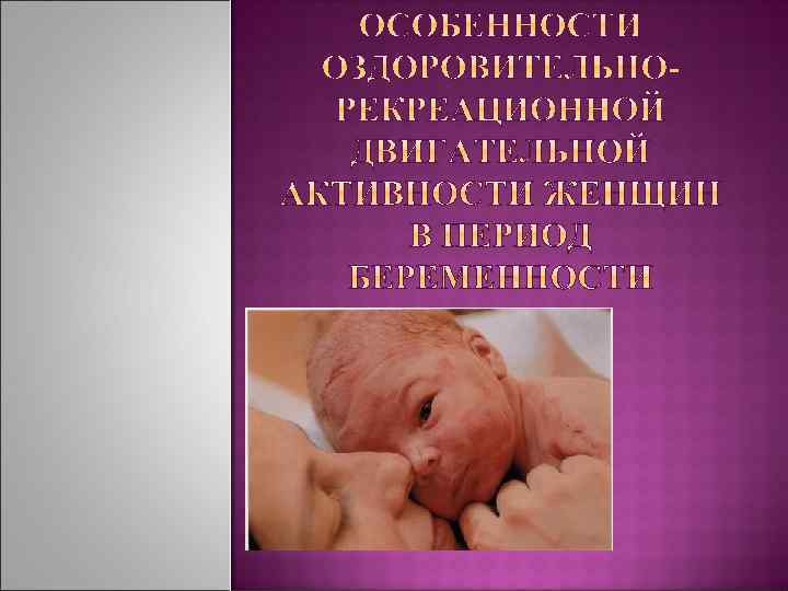 ПОЛОЖИТЕЛЬНО ВЛИЯЮТ НА ОРГАНИЗМ БЕРЕМЕННЫХ ЖЕНЩИН РЕГУЛЯРНЫЕ ЗАНЯТИЯ ПО ПРАВИЛЬНО СОСТАВЛЕННЫМ ПРЕНАТАЛЬНЫМ ПРОГРАММАМ ДВИГАТЕЛЬНОЙ АКТИВНОСТИ более высокому уровню подготовленности кардиореспираторной и мышечной систем; лучшей восстанавливаемости после родов; более быстрому восстановлению исходной массы тела, а также уровню силовых показате лей и гибкости после родов; более полному восстановлению исходной формы передней стенки живота после родов; значительно меньшей вероятности болей в пояснице; более высокому энергетическому потенциалу; более низкой вероятности врачебного вме шательства при родах; более быстрым и менее болезненным родам; меньшему увеличению массы тела во время беременности; более стабильному психическому благо получию, которое может ослабить проявления стресса, тревожности и депрессии, часто наблю дающемуся во время беременности; более высокой вероятности выбора здорово го образа жизни после родов