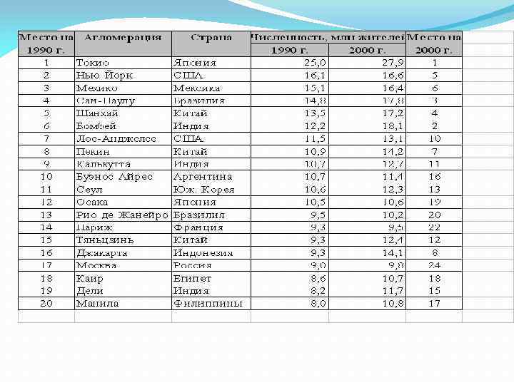 Рост городского населения за 1950 -2010 гг. Показатель Год 1950 Населениеземли, млн. человек Городское население в мире, млн. человек % городского населения 1970 1990 2000 2015 2515 3698 5328 6000 7397 734 1391 2234 2820 3994 29 37 42 47 54