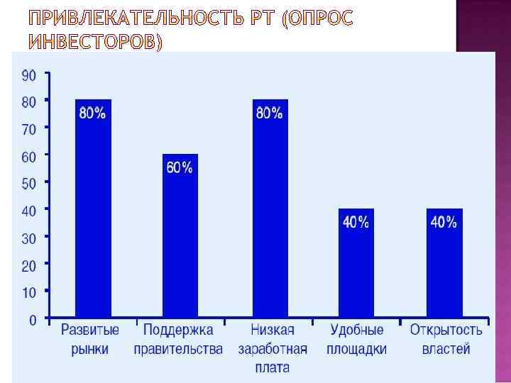 Оценка уровня общеэкономического развития региона – 35% Оценка уровня инвестиционной инфраструктуры в регионе – 15% Демографическая характеристика региона – 15% Уровень развития рыночных отношений и коммерческой инфраструктуры в регионе 25% . Оценка степени безопасности инвестиционной деятельности в регионе – 10%