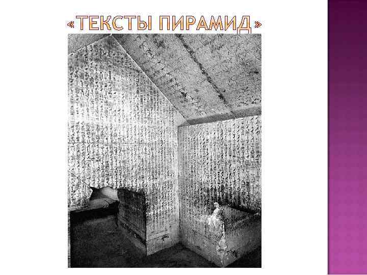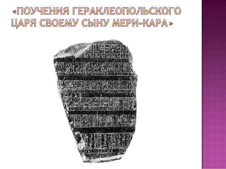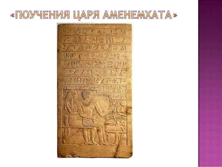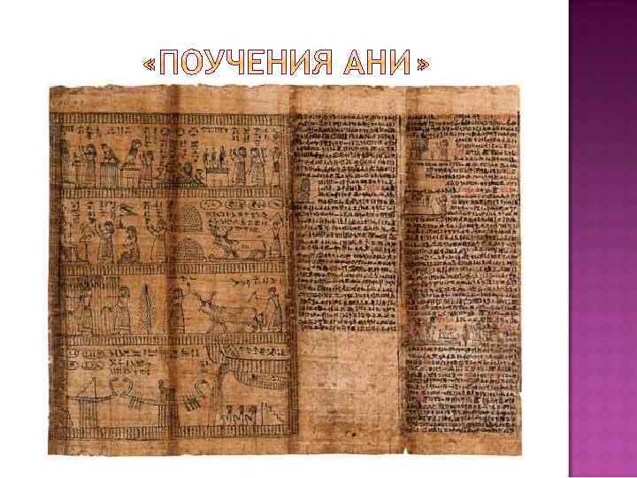 «Тексты пирамид» (XXIV век до Н. Э. ) «Поучения гераклеопольского царя своему сыну Мери-Кара» Ахтоя III (XXII век до Н. Э. ) «Поучения царя Аменемхата» (XX век до Н. Э. ) Иероглифические надписи Тутмоса III (XIV век до Н. Э. ) «Поучения Ани» (XII век до Н. Э. )
