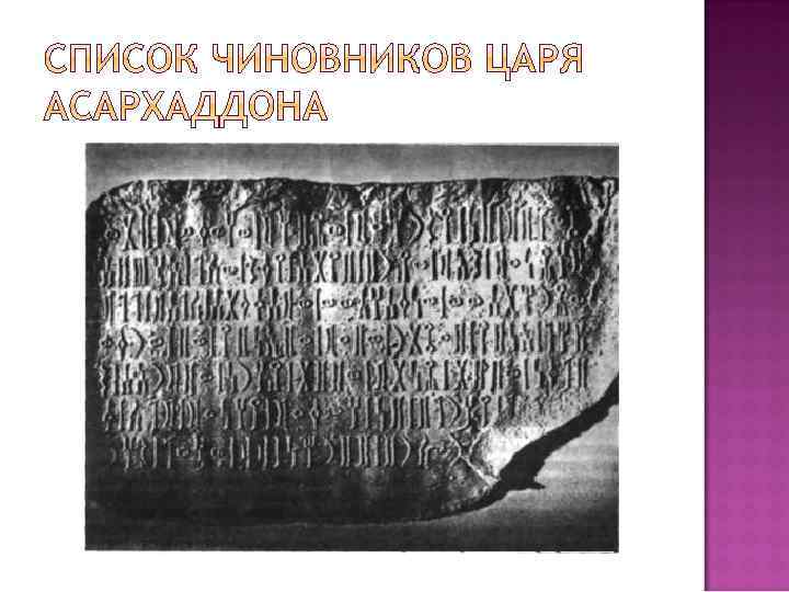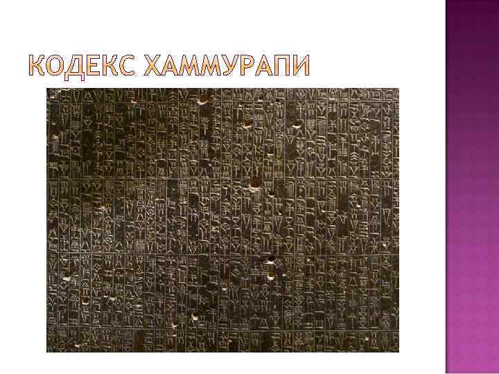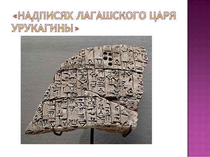 «Надписи Лагашского царя Урукагины» (XXIV век до Н. Э. ) Кодекс Хаммурапи (XVIII век до Н. Э. ) «Вавилонская теодицея» (XI век до Н. Э. ) Список чиновников царя Асархаддона (VII век до Н. Э. )