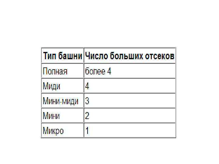Классификация башeн по числу отсеков • Число больших внешних отсеков, как увидим чуть ниже, является важным параметром выбора. Поэтому башни удобно различать по этому числу, придерживаясь следующих названий (в порядке возрастания): микро (micro), мини (mini), мини-миди, миди (midi, middle - средняя) и полная (big, full).
