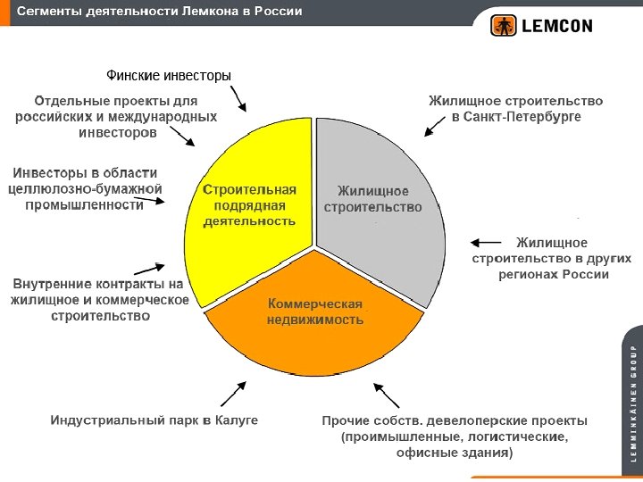 Основные данные Концерн «ЛЕММИНКЯЙНЕН» • Основан в 1910 • Старейшая строительная компания в Финляндии • Вторая по величине строительная компания в Финляндии • Наиболее разветвленная международная деятельность • Численность работников 9 800 (в среднем за 2008 год) • Объем чистых продаж 2 482 млн. евро (2008) • Котируется на Хельсингской фондовой бирже NASDAQ OMX