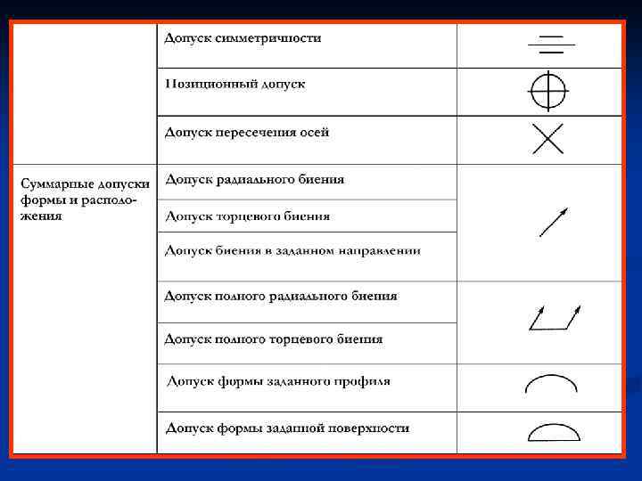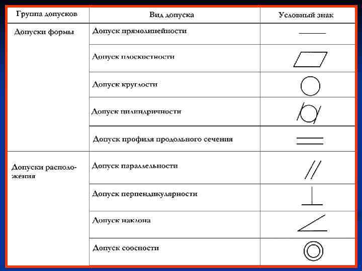 Условные обозначения допусков помещаютв прямоугольную рамку, разделенную на две или три части. В первой проставляют условный знак допуска , во второй — числовое значение допуска в миллиметрах , в третьей —буквенное обозначение базы.