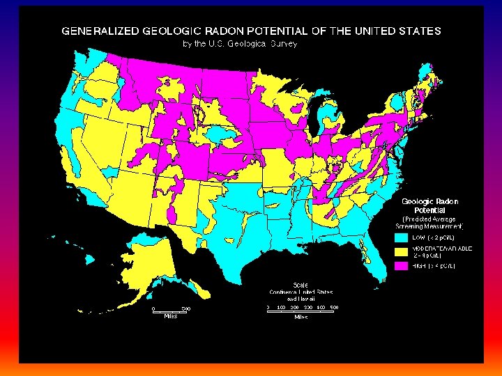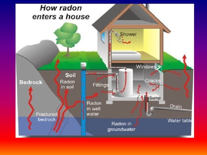 Part II: Sources of Radiation • background radiation = low-level radiation emitted by naturally occurring isotopes in the rocks, soil, water, and the atmosphere, as well as building materials (bricks, concrete, wood). • as a result, all plants and animals contain some small amounts of these isotopes (such as 14 C). • largest source of background rad. is radon gas (Rn): • comes from the natural decay of 238 U in Earth’s crust • Rn itself emits alpha particles as it decays • Rn seeps into houses through basement walls in contact with soil