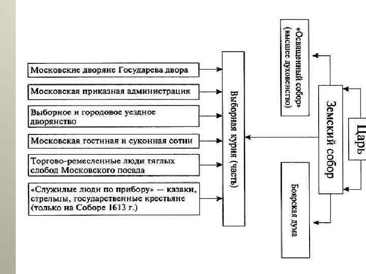 Как осуществляется власть на местах (взимаются налоги и тд) Что меняется в результате Смуты: результате реформ Избранной Рады 1550 х годов: Местные дворяне и черносошные крестьяне !Выборы на местах! Губные и земские ВОЕВОДА старосты УЕЗД Назначение из центра УЕЗД Губные и земские ВОЕВОДА старосты !Выборы на местах! Местные дворяне и черносошные крестьяне !Выборы на местах! ВОЕВОДА Губные и земские старосты УЕЗД Назначение из центра ЦЕНТР Назначение из центра УЕЗД Губные и земские ВОЕВОДА старосты !Выборы на местах! Местные дворяне и черносошные крестьяне
