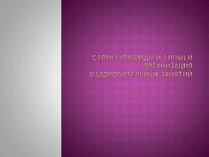1. Ациклические упражнения: Утренняя гигиеническая гимнастика и производственная гимнастика Ритмическая гимнастика Атлетическая гимнастика Гимнастика по системе “ХАТХА-ЙОГА” 2. Циклические упражнения: Аэробика Оздоровительный бег Ходьба на лыжах Плавание