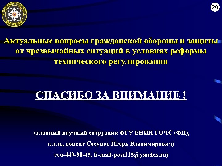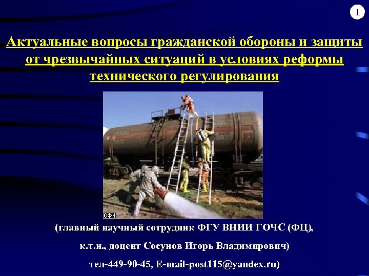 1 Актуальные вопросы гражданской обороны и защиты от чрезвычайных ситуаций в условиях реформы технического регулирования (главный научный сотрудник ФГУ ВНИИ ГОЧС (ФЦ), к. т. н. , доцент Сосунов Игорь Владимирович) тел-449 -90 -45, Е-mail-post 115@yandex. ru)