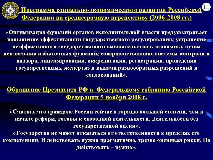 Программа социально-экономического развития Российской 11 Федерации на среднесрочную перспективу (2006 -2008 гг. ) «Оптимизация функций органов исполнительной власти предусматривает повышение эффективности государственного регулирования; устранение неэффективного государственного вмешательства в экономику путем исключения избыточных функций; совершенствование системы контроля и надзора, лицензирования, аккредитации, регистрации, проведения государственных экспертиз и выдачи разнообразных разрешений и согласований» . Обращение Президента РФ к Федеральному собранию Российской Федерации 5 ноября 2008 г. «Считаю, что граждане России сейчас в гораздо большей степени, чем в начале реформ, готовы к свободной деятельности. Деятельности без государственной опеки» . «Государство не может отказаться от ответственности в пределах его компетенции. И действовать нужно прагматично, трезво оценивая риски. Но действовать – нужно» .