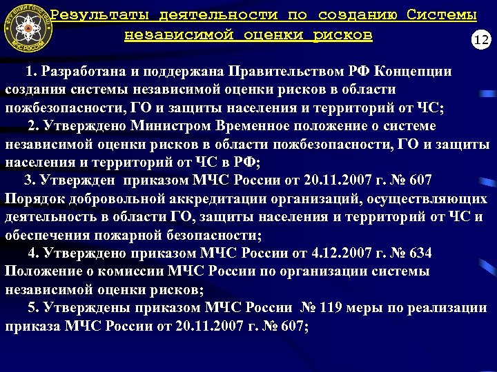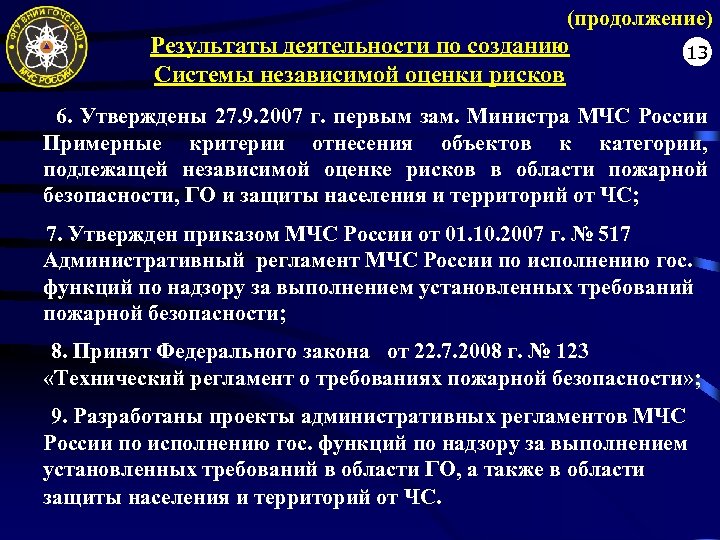 Результаты деятельности по созданию Системы независимой оценки рисков 12 1. Разработана и поддержана Правительством РФ Концепции создания системы независимой оценки рисков в области пожбезопасности, ГО и защиты населения и территорий от ЧС; 2. Утверждено Министром Временное положение о системе независимой оценки рисков в области пожбезопасности, ГО и защиты населения и территорий от ЧС в РФ; 3. Утвержден приказом МЧС России от 20. 11. 2007 г. № 607 Порядок добровольной аккредитации организаций, осуществляющих деятельность в области ГО, защиты населения и территорий от ЧС и обеспечения пожарной безопасности; 4. Утверждено приказом МЧС России от 4. 12. 2007 г. № 634 Положение о комиссии МЧС России по организации системы независимой оценки рисков; 5. Утверждены приказом МЧС России № 119 меры по реализации приказа МЧС России от 20. 11. 2007 г. № 607;