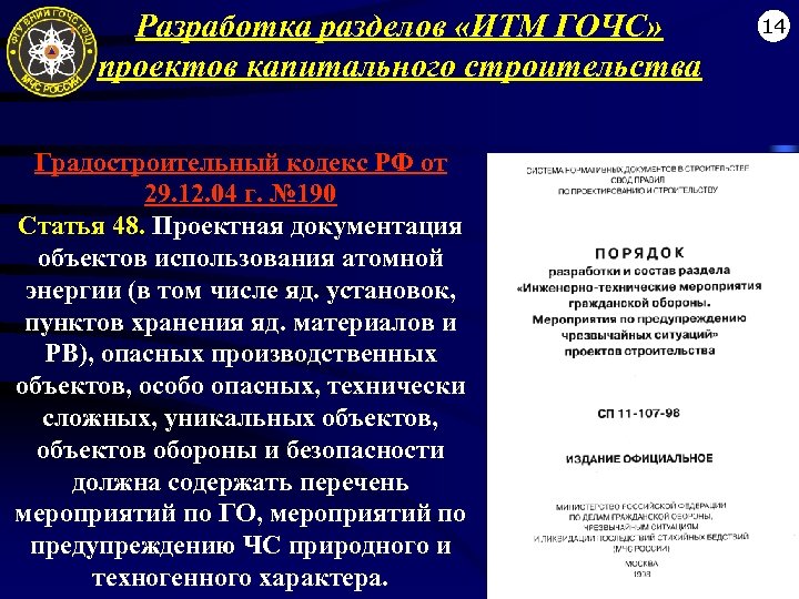Разработка разделов «ИТМ ГОЧС» проектов капитального строительства Градостроительный кодекс РФ от 29. 12. 04 г. № 190 Статья 48. Проектная документация объектов использования атомной энергии (в том числе яд. установок, пунктов хранения яд. материалов и РВ), опасных производственных объектов, особо опасных, технически сложных, уникальных объектов, объектов обороны и безопасности должна содержать перечень мероприятий по ГО, мероприятий по предупреждению ЧС природного и техногенного характера. 14