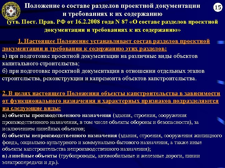 Положение о составе разделов проектной документации и требованиях к их содержанию 15 (утв. Пост. Прав. РФ от 16. 2. 2008 года N 87 «О составе разделов проектной документации и требованиях к их содержанию» 1. Настоящее Положение устанавливает состав разделов проектной документации и требования к содержанию этих разделов: а) при подготовке проектной документации на различные виды объектов капитального строительства; б) при подготовке проектной документации в отношении отдельных этапов строительства, реконструкции и капремонта объектов капстроительства. 2. В целях настоящего Положения объекты капстроительства в зависимости от функционального назначения и характерных признаков подразделяются на следующие виды: а) объекты производственного назначения (здания, строения, сооружения производственного назначения, в том числе объекты обороны и безопасности), за исключением линейных объектов; б) объекты непроизводственного назначения (здания, строения, сооружения жилищного фонда, социально-культурного и коммунально-бытового назначения, а также иные объекты капстроительства непроизводственного назначения); в) линейные объекты (трубопроводы, автомобильные и железные дороги, линии электропередачи и др. ).