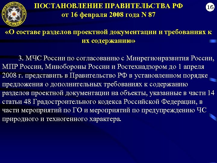 ПОСТАНОВЛЕНИЕ ПРАВИТЕЛЬСТВА РФ от 16 февраля 2008 года N 87 16 «О составе разделов проектной документации и требованиях к их содержанию» 3. МЧС России по согласованию с Минрегионразвития России, МПР России, Минобороны России и Ростехнадзором до 1 апреля 2008 г. представить в Правительство РФ в установленном порядке предложения о дополнительных требованиях к содержанию разделов проектной документации на объекты, указанные в части 14 статьи 48 Градостроительного кодекса Российской Федерации, в части мероприятий по ГО и мероприятий по предупреждению ЧС природного и техногенного характера.