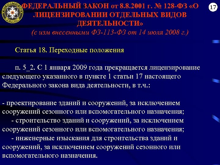 ФЕДЕРАЛЬНЫЙ ЗАКОН от 8. 8. 2001 г. № 128 -ФЗ «О ЛИЦЕНЗИРОВАНИИ ОТДЕЛЬНЫХ ВИДОВ ДЕЯТЕЛЬНОСТИ» (с изм внесенными ФЗ-113 -ФЗ от 14 июля 2008 г. ) Статья 18. Переходные положения п. 5_2. С 1 января 2009 года прекращается лицензирование следующего указанного в пункте 1 статьи 17 настоящего Федерального закона вида деятельности, в т. ч. : - проектирование зданий и сооружений, за исключением сооружений сезонного или вспомогательного назначения; - строительство зданий и сооружений, за исключением сооружений сезонного или вспомогательного назначения; - инженерные изыскания для строительства зданий и сооружений, за исключением сооружений сезонного или вспомогательного назначения. 17