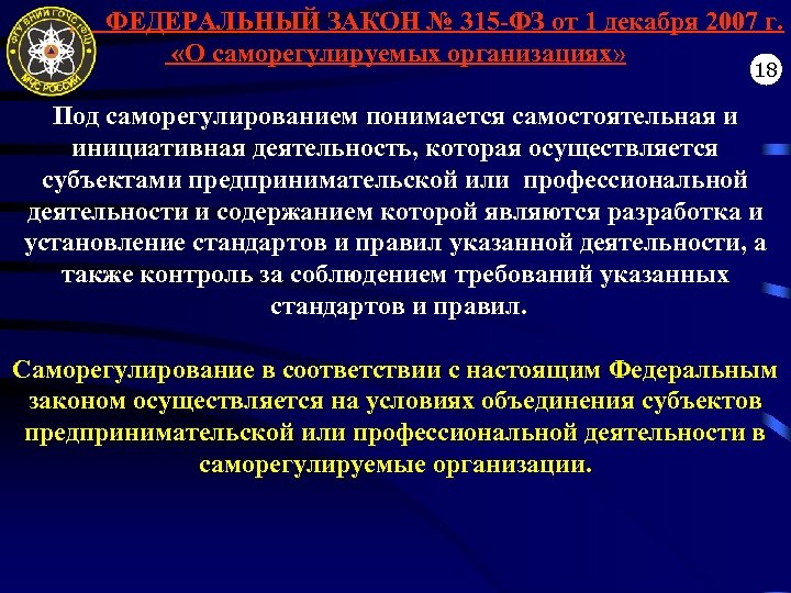 ФЕДЕРАЛЬНЫЙ ЗАКОН № 315 -ФЗ от 1 декабря 2007 г. «О саморегулируемых организациях» 18 Под саморегулированием понимается самостоятельная и инициативная деятельность, которая осуществляется субъектами предпринимательской или профессиональной деятельности и содержанием которой являются разработка и установление стандартов и правил указанной деятельности, а также контроль за соблюдением требований указанных стандартов и правил. Саморегулирование в соответствии с настоящим Федеральным законом осуществляется на условиях объединения субъектов предпринимательской или профессиональной деятельности в саморегулируемые организации.