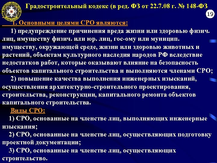 Градостроительный кодекс (в ред. ФЗ от 22. 7. 08 г. № 148 -ФЗ 19 1. Основными целями СРО являются: 1) предупреждение причинения вреда жизни или здоровью физич. лиц, имуществу физич. или юр. лиц, гос-ому или муницип. имуществу, окружающей среде, жизни или здоровью животных и растений, объектам культурного наследия народов РФ вследствие недостатков работ, которые оказывают влияние на безопасность объектов капитального строительства и выполняются членами СРО; 2) повышение качества выполнения инженерных изысканий, осуществления архитектурно-строительного проектирования, строительства, реконструкции, капитального ремонта объектов капитального строительства. Виды СРО: 1) СРО, основанные на членстве лиц, выполняющих инженерные изыскания; 2) СРО, основанные на членстве лиц, осуществляющих подготовку проектной документации; 3) СРО, основанные на членстве лиц, осуществляющих строительство.