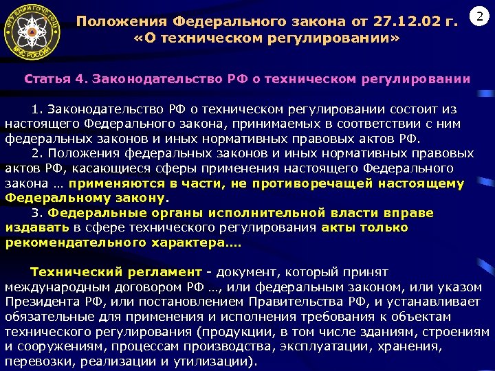 Положения Федерального закона от 27. 12. 02 г. «О техническом регулировании» 2 Статья 4. Законодательство РФ о техническом регулировании 1. Законодательство РФ о техническом регулировании состоит из настоящего Федерального закона, принимаемых в соответствии с ним федеральных законов и иных нормативных правовых актов РФ. 2. Положения федеральных законов и иных нормативных правовых актов РФ, касающиеся сферы применения настоящего Федерального закона … применяются в части, не противоречащей настоящему Федеральному закону. 3. Федеральные органы исполнительной власти вправе издавать в сфере технического регулирования акты только рекомендательного характера…. Технический регламент - документ, который принят международным договором РФ …, или федеральным законом, или указом Президента РФ, или постановлением Правительства РФ, и устанавливает обязательные для применения и исполнения требования к объектам технического регулирования (продукции, в том числе зданиям, строениям и сооружениям, процессам производства, эксплуатации, хранения, перевозки, реализации и утилизации).