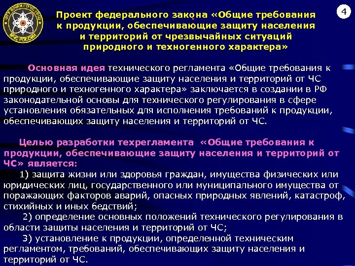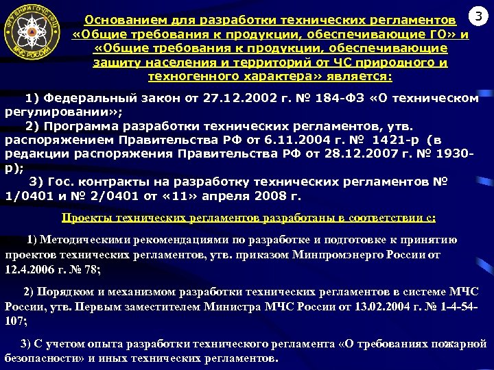 3 Основанием для разработки технических регламентов «Общие требования к продукции, обеспечивающие ГО» и «Общие требования к продукции, обеспечивающие защиту населения и территорий от ЧС природного и техногенного характера» является: 1) Федеральный закон от 27. 12. 2002 г. № 184 -ФЗ «О техническом регулировании» ; 2) Программа разработки технических регламентов, утв. распоряжением Правительства РФ от 6. 11. 2004 г. № 1421 -р (в редакции распоряжения Правительства РФ от 28. 12. 2007 г. № 1930 р); 3) Гос. контракты на разработку технических регламентов № 1/0401 и № 2/0401 от « 11» апреля 2008 г. Проекты технических регламентов разработаны в соответствии с: 1) Методическими рекомендациями по разработке и подготовке к принятию проектов технических регламентов, утв. приказом Минпромэнерго России от 12. 4. 2006 г. № 78; 2) Порядком и механизмом разработки технических регламентов в системе МЧС России, утв. Первым заместителем Министра МЧС России от 13. 02. 2004 г. № 1 -4 -54107; 3) С учетом опыта разработки технического регламента «О требованиях пожарной безопасности» и иных технических регламентов.