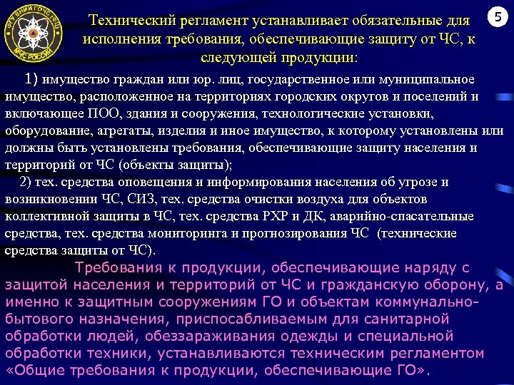 Проект федерального закона «Общие требования : к продукции, обеспечивающие защиту населения и территорий от чрезвычайных ситуаций природного и техногенного характера» 4 Основная идея технического регламента «Общие требования к продукции, обеспечивающие защиту населения и территорий от ЧС природного и техногенного характера» заключается в создании в РФ законодательной основы для технического регулирования в сфере установления обязательных для исполнения требований к продукции, обеспечивающих защиту населения и территорий от ЧС. Целью разработки техрегламента «Общие требования к продукции, обеспечивающие защиту населения и территорий от ЧС» является: 1) защита жизни или здоровья граждан, имущества физических или юридических лиц, государственного или муниципального имущества от поражающих факторов аварий, опасных природных явлений, катастроф, стихийных и иных бедствий; 2) определение основных положений технического регулирования в области защиты населения и территорий от ЧС; 3) установление к продукции, определенной техническим регламентом, требований, обеспечивающих защиту населения и территорий от ЧС.