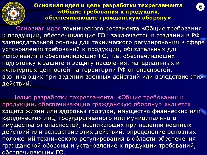 Основная идея и цель разработки техрегламента «Общие требования к продукции, : обеспечивающие гражданскую оборону» 6 Основная идея технического регламента «Общие требования к продукции, обеспечивающие ГО» заключается в создании в РФ законодательной основы для технического регулирования в сфере установления требований к продукции, обязательных для исполнения и обеспечивающих ГО, т. е. обеспечивающих подготовку к защите и защиту населения, материальных и культурных ценностей на территории РФ от опасностей, возникающих при ведении военных действий или вследствие этих действий. Целью разработки техрегламента «Общие требования к продукции, обеспечивающие гражданскую оборону» является защита жизни или здоровья граждан, имущества физических или юридических лиц, государственного или муниципального имущества от опасностей, возникающих при ведении военных действий или вследствие этих действий, определение основных положений технического регулирования в области обеспечения гражданской обороны и установление к продукции требований, обеспечивающих ГО.
