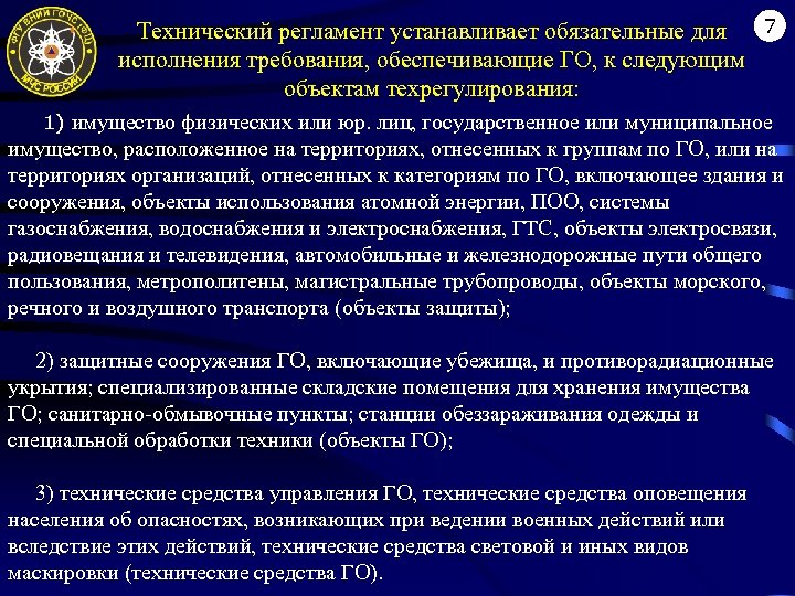 7 Технический регламент устанавливает обязательные для исполнения требования, обеспечивающие ГО, к следующим объектам техрегулирования: 1) имущество физических или юр. лиц, государственное или муниципальное имущество, расположенное на территориях, отнесенных к группам по ГО, или на территориях организаций, отнесенных к категориям по ГО, включающее здания и сооружения, объекты использования атомной энергии, ПОО, системы газоснабжения, водоснабжения и электроснабжения, ГТС, объекты электросвязи, радиовещания и телевидения, автомобильные и железнодорожные пути общего пользования, метрополитены, магистральные трубопроводы, объекты морского, речного и воздушного транспорта (объекты защиты); 2) защитные сооружения ГО, включающие убежища, и противорадиационные укрытия; специализированные складские помещения для хранения имущества ГО; санитарно-обмывочные пункты; станции обеззараживания одежды и специальной обработки техники (объекты ГО); 3) технические средства управления ГО, технические средства оповещения населения об опасностях, возникающих при ведении военных действий или вследствие этих действий, технические средства световой и иных видов маскировки (технические средства ГО).