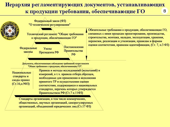 Иерархия регламентирующих документов, устанавливающих 8 к продукции требования, обеспечивающие ГО