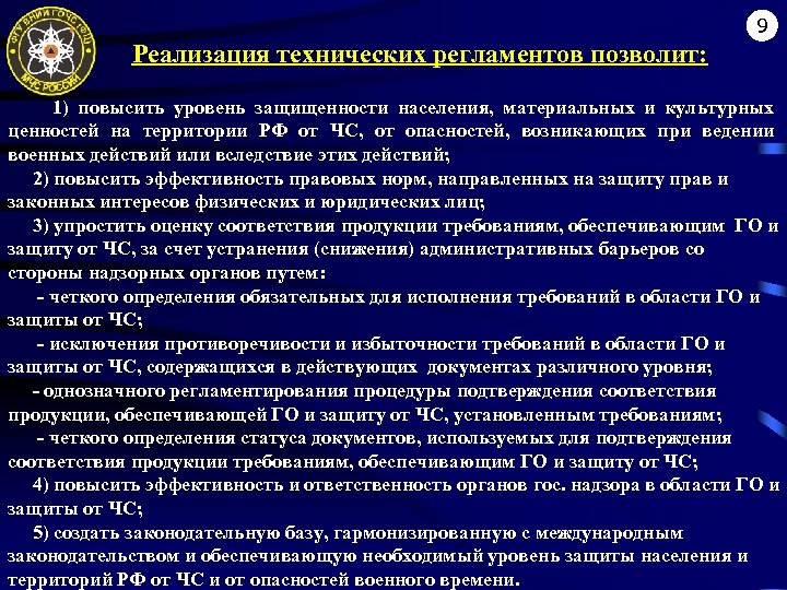 9 Реализация технических регламентов позволит: 1) повысить уровень защищенности населения, материальных и культурных ценностей на территории РФ от ЧС, от опасностей, возникающих при ведении военных действий или вследствие этих действий; 2) повысить эффективность правовых норм, направленных на защиту прав и законных интересов физических и юридических лиц; 3) упростить оценку соответствия продукции требованиям, обеспечивающим ГО и защиту от ЧС, за счет устранения (снижения) административных барьеров со стороны надзорных органов путем: - четкого определения обязательных для исполнения требований в области ГО и защиты от ЧС; - исключения противоречивости и избыточности требований в области ГО и защиты от ЧС, содержащихся в действующих документах различного уровня; - однозначного регламентирования процедуры подтверждения соответствия продукции, обеспечивающей ГО и защиту от ЧС, установленным требованиям; - четкого определения статуса документов, используемых для подтверждения соответствия продукции требованиям, обеспечивающим ГО и защиту от ЧС; 4) повысить эффективность и ответственность органов гос. надзора в области ГО и защиты от ЧС; 5) создать законодательную базу, гармонизированную с международным законодательством и обеспечивающую необходимый уровень защиты населения и территорий РФ от ЧС и от опасностей военного времени.