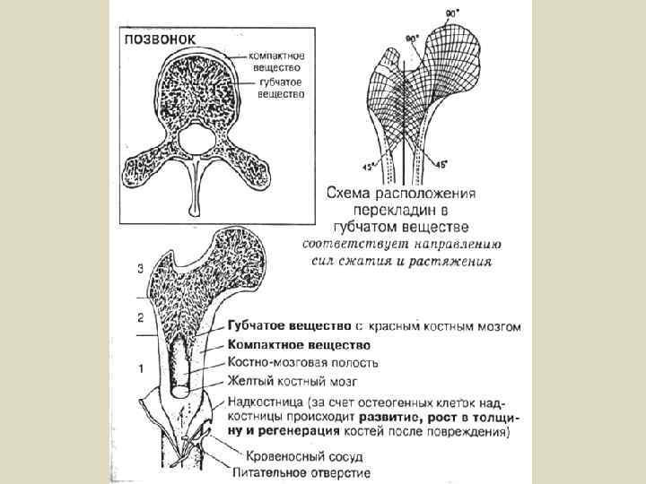 КОСТИ являются твердой опорой мягких тканей тела и рычагами, перемещающимися силой сокращения мышц. В состав кости входит костная ткань, костный мозг, надкостница, нервы, сосуды и суставные хрящи. Химический состав кости: 30% органических веществ (белок – коллаген, углеводы – полисахариды, лимонная кислота, ферменты), 60% минеральных веществ (99% всего кальция в организме, соли фосфора, магния) и 10% воды.