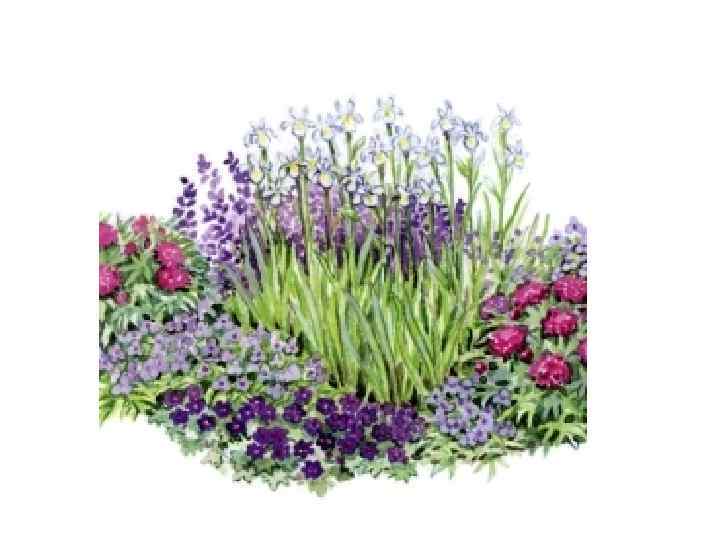 1. Баптизия южная 2. Ирис восточный 3. Пион молочноцветковый 4. Традесканция гибридная 5. Герань гибридная