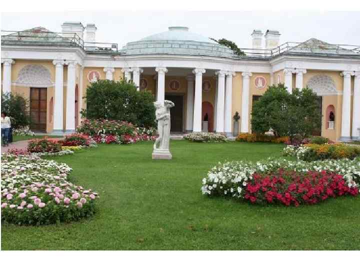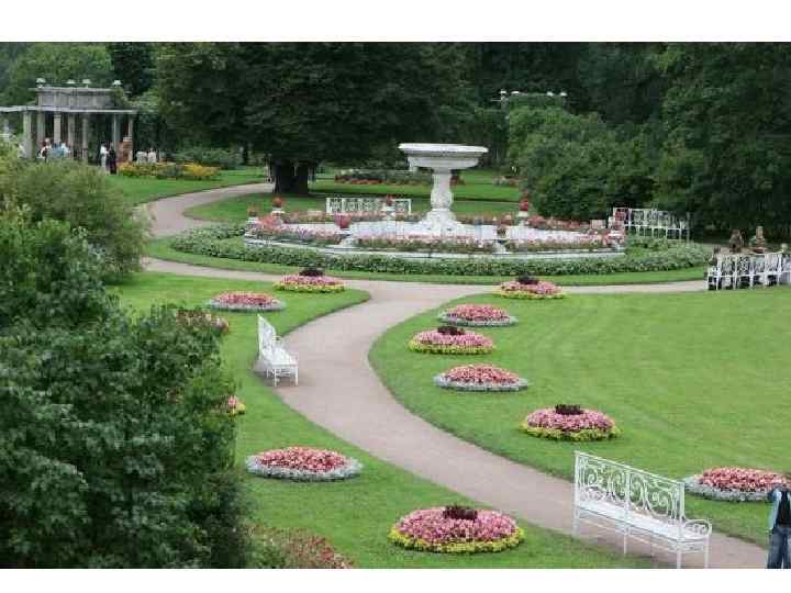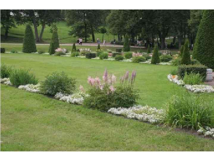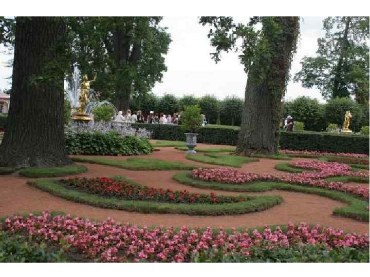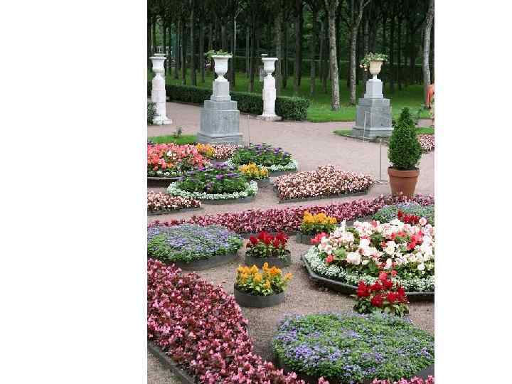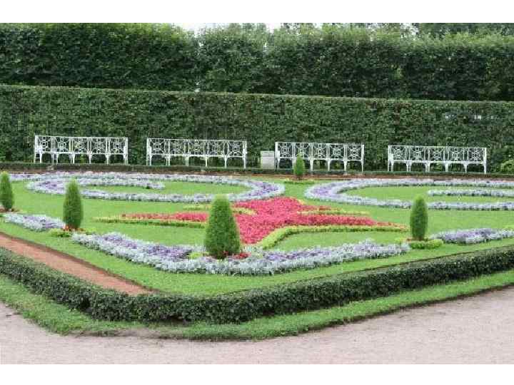 Анализ композиции: Достаточно сложный цветник. Сейчас здесь нет композиционного решения вообще. Но эксперименты по подбору растений и цветовой гаммы проводятся каждый год. Это исторический разрезной партер во французском стиле. Основа – это узор в обрамлении газона, который диктует необходимость того, что бы композиция была выдержана по форме и содержанию. Прием «ковровости» здесь не подходит. Не хватает разновысотности и объема. В одной высоте он выглядит скучно. Но сам узор достаточно интересен, и каждый элемент имеет свое место. Этот цветник должен быть таким, каким он был задуман садовыми мастерами той эпохи.