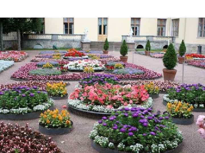 Анализ композиции: Здесь впервые был проведен эксперимент – в рабатку из однолетников были введены красивоцветущие многолетники – пион, лилейник, астильбе. Они создают своеобразную вертикальную ось композиции и подчеркивают парадность этой рабатки.