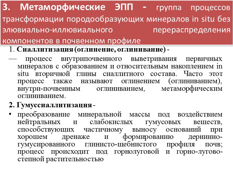 3. Метаморфические ЭПП - группа процессов трансформации породообразующих минералов in situ без элювиально-иллювиального перераспределения компонентов в почвенном профиле 1. Сиаллитизация (оглинение, оглинивание) - — процесс внутрипочвенного выветривания первичных минералов с образованием и относительным накоплением in situ вторичной глины сиаллитного состава. Часто этот процесс также называют оглинением (оглиниванием), внутри-почвенным оглиниванием, метаморфическим оглиниванием. 2. Гумуссиаллитизация - преобразование минеральной массы под воздействием нейтральных и слабокислых гумусовых веществ, способствующих частичному выносу оснований при хорошем дренаже и формированию дернинно-гумусированного глинисто-щебнистого профиля почв; процесс происходит под горнолуговой и горно-лугово-степной растительностью