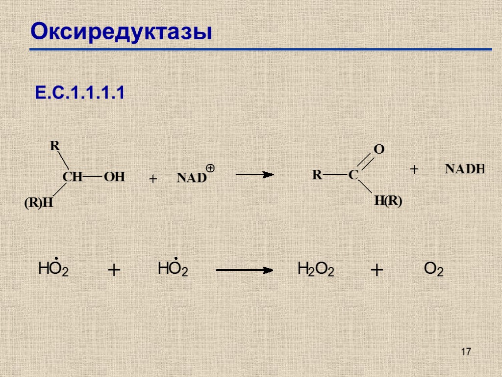16 Оксиредуктазы Е.С.1.1.1.1. – алкоголь дегидрогеназа NAD+ Е.С.1.1.1.2. – алкоголь дегидрогеназа NADP+ …………………………………………………. Е.С.1.1.1.27 – L-лактат дегидрогеназа …………………………………………………. Е.С.1.1.1.32 – мевальдат редуктаза ………………………………………………… Е.С.1.1.1.62 – эстрадиол 17-β-дегидрогеназа