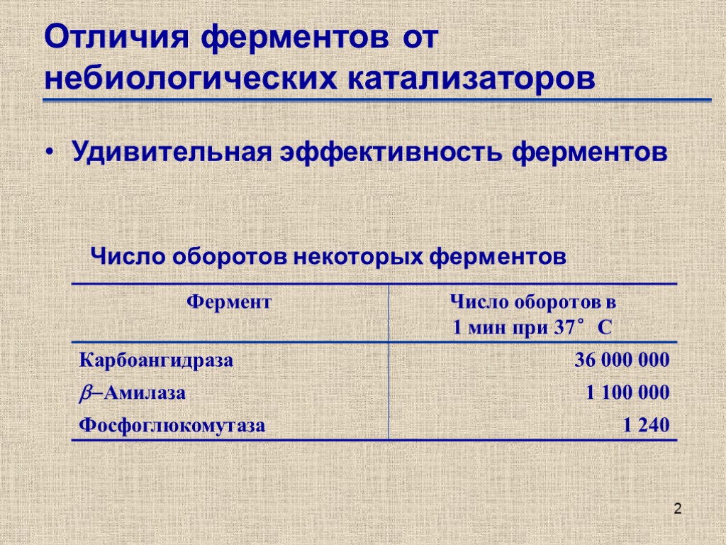 2 Отличия ферментов от небиологических катализаторов Удивительная эффективность ферментов Число оборотов некоторых ферментов