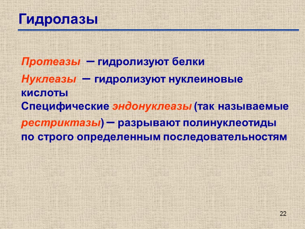 22 Гидролазы Протеазы – гидролизуют белки Нуклеазы – гидролизуют нуклеиновые кислоты Специфические эндонуклеазы (так называемые рестриктазы) – разрывают полинуклеотиды по строго определенным последовательностям
