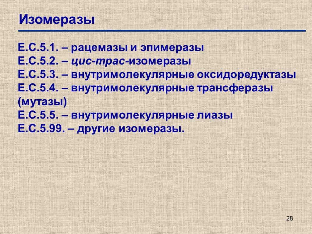 28 Изомеразы Е.С.5.1. – рацемазы и эпимеразы Е.С.5.2. – цис-трас-изомеразы Е.С.5.3. – внутримолекулярные оксидоредуктазы Е.С.5.4. – внутримолекулярные трансферазы (мутазы) Е.С.5.5. – внутримолекулярные лиазы Е.С.5.99. – другие изомеразы.