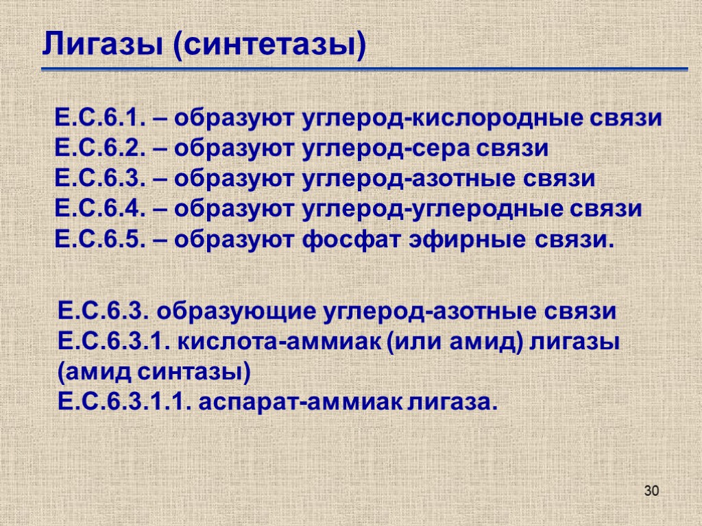 30 Лигазы (синтетазы) Е.С.6.1. – образуют углерод-кислородные связи Е.С.6.2. – образуют углерод-сера связи Е.С.6.3. – образуют углерод-азотные связи Е.С.6.4. – образуют углерод-углеродные связи Е.С.6.5. – образуют фосфат эфирные связи. Е.С.6.3. образующие углерод-азотные связи Е.С.6.3.1. кислота-аммиак (или амид) лигазы (амид синтазы) Е.С.6.3.1.1. аспарат-аммиак лигаза.