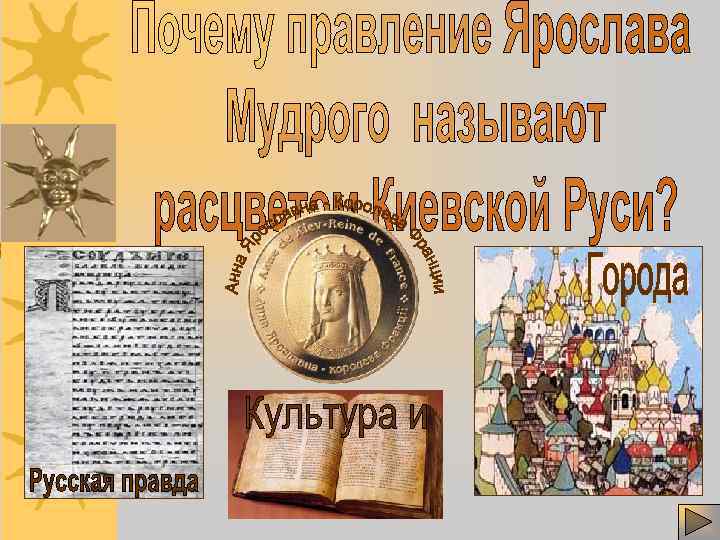 1. Борьба за власть между сыновьями Владимира Святославича. 2. Расцвет Киевской Руси в правление Ярослава Мудрого 3. «Русская правда» первые законы нашего Отечества.