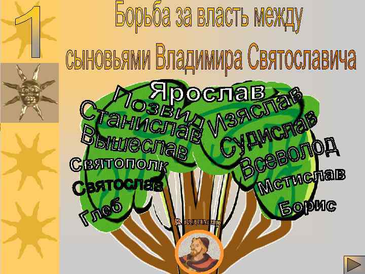Кто из его сыновей 1015 г. – имел больше Умер прав на Киевский стол? князь Владимир Святополк Ярополкович. Пасынок Владимира. Святославич Старший в княжеском роду. Киев Ярослав Владимирович. Старший из оставшихся в живых родных сыновей Владимира. Борис и Глеб. Младшие сыновья Владимира, рожденные в христианском браке. Бориса видел отец своим преемником. Лествичное право