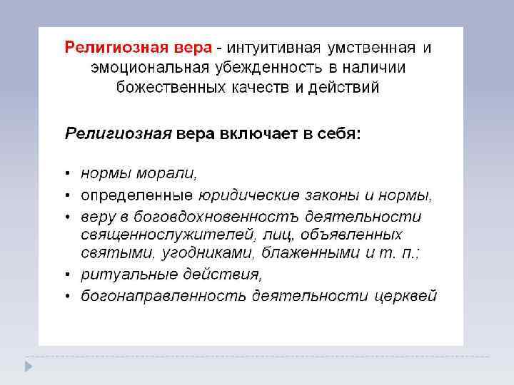 Вера выражает специфическое отношение к действительности или воображаемым объектам, явлениям, когда их достоверность и истинность принимаются без доказательств. Религия — это не только комплекс представлений, верований, доктрин, но и культ (от лат. cultus — возделывание, уход, почитание, поклонение), ритуалы и иные формы практического воплощения веры.