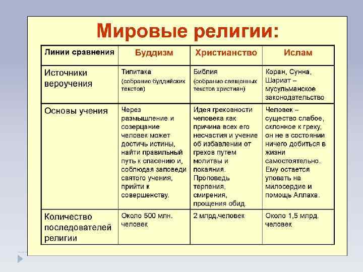 стремление обратить в свою веру лиц другого исповедания ислам христианств о —католицизм —православие —протестантизм — суннизм — шиизм Космополитичность проповедуют равенство всех людей, обращены к представителя м всех социальных групп Пропагандистская активность и прозелитизм Огромное число последовател ей во всём мире Эгалитарность Признаки мировых религий носят меж- и надэтнический характер, выходя за переделы наций и государств буддизм