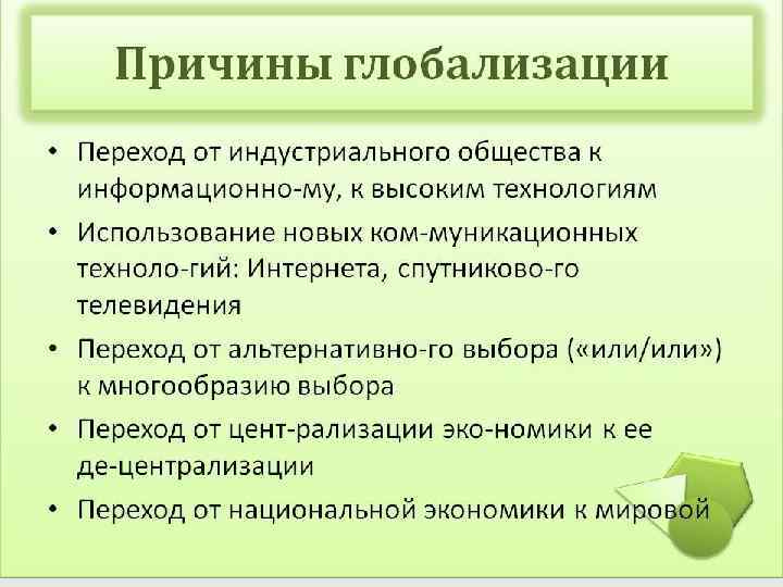 Причины возникновения глобальных проблем Развитие взаимосвязи и взаимозависимос ти в современном мире, его целостность. Интенсивность преобразующей деятельности человека в условиях общества потребления Недостаточный уровень политического мышления, экологического сознания, общественной организации. Отставание уровня нравственного развития от научнотехнического.