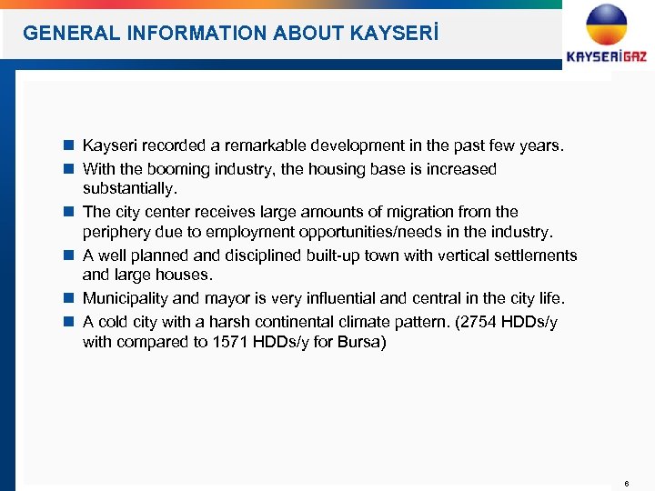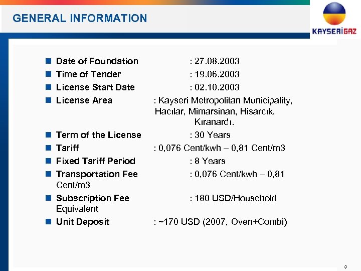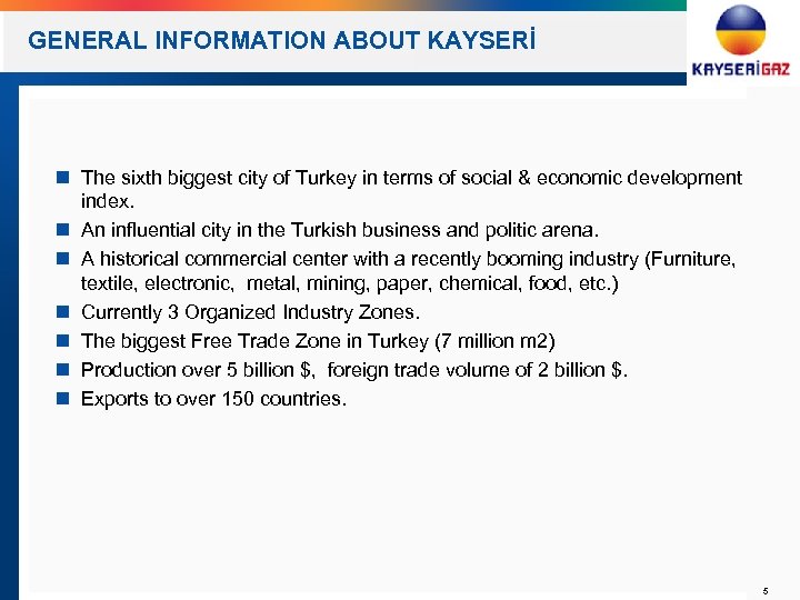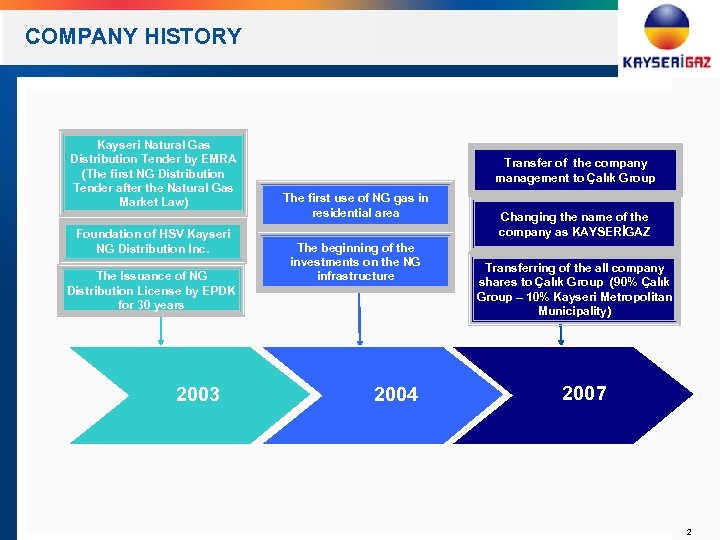 COMPANY HISTORY Kayseri Natural Gas Distribution Tender by EMRA (The first NG Distribution Tender after the Natural Gas Market Law) Foundation of HSV Kayseri NG Distribution Inc. The Issuance of NG Distribution License by EPDK for 30 years 2003 Transfer of the company management to Çalık Group The first use of NG gas in residential area The beginning of the investments on the NG infrastructure 2004 Changing the name of the company as KAYSERİGAZ Transferring of the all company shares to Çalık Group (90% Çalık Group – 10% Kayseri Metropolitan Municipality) 2007 2