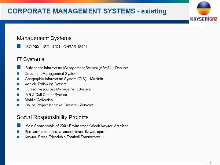 CORPORATE MANAGEMENT SYSTEMS - existing Management Systems n ISO 9001, ISO 14001, OHSAS 18001 IT Systems n Subscriber Information Management System (ABYS) – Docuart n n n n Document Management System Geographic Information System (GIS) – Mapinfo Vehicle Following System Human Resources Management System IVR & Call Center System Mobile Collection Online Project Approval System - Zetacad Social Responsibility Projects n Main Sponsorship of 2007 Environment Week Kayseri Activities n n Sponsorhip to the local soccer team, Kayserispor. Kayseri Press Friendship Football Tournament 7