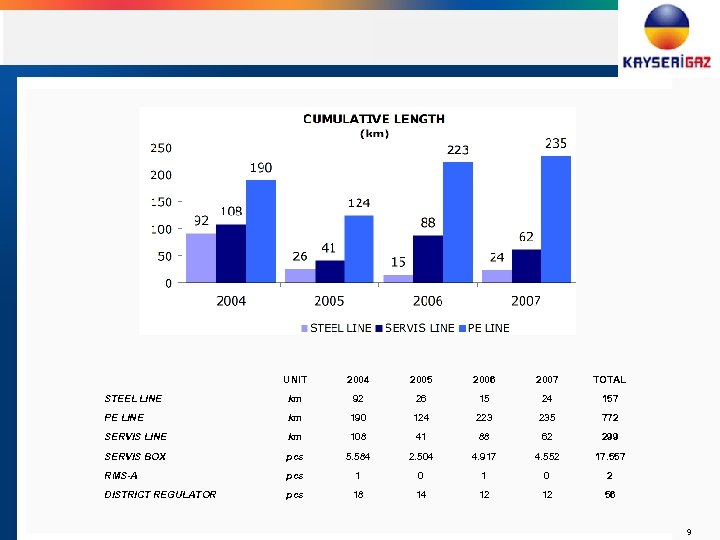 UNIT 2004 2005 2006 2007 TOTAL STEEL LINE km 92 26 15 24 157 PE LINE km 190 124 223 235 772 SERVIS LINE km 108 41 88 62 299 SERVIS BOX pcs 5. 584 2. 504 4. 917 4. 552 17. 557 RMS-A pcs 1 0 2 DISTRICT REGULATOR pcs 18 14 12 12 56 9