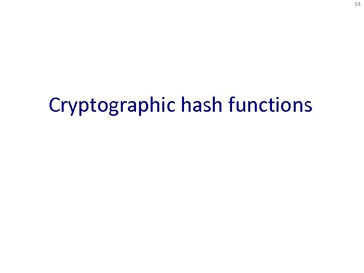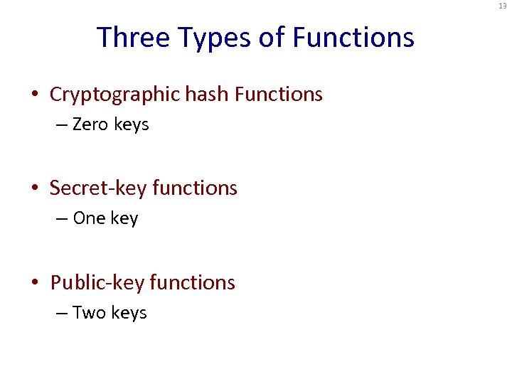 13 Three Types of Functions • Cryptographic hash Functions – Zero keys • Secret-key functions – One key • Public-key functions – Two keys